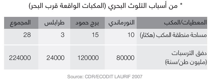 يتلقى البحر مياه سطحية ملوثة من مصبات الأنهر ناتجة عن المصانع والمنازل إضافة إلى إفراغات الزراعة الساحلية ، كذلك نفايات منجرفة من مكبات موجودة في أودية قريبة إلى البحر ناهيك بالإفراغ الدوري أو المتعمد لزيوت السفن. حاليًا يوجد حوالي 53 قسطل مياه مبتذلة موزع على طول الساحل اللبناني. ما يزيد في قذارة هذا الساحل مخلفات المنتجعات البحرية التي لا تحصى بالاضافة لمشاريع الردم والاستصلاح العمراني والمرافق البحرية.
