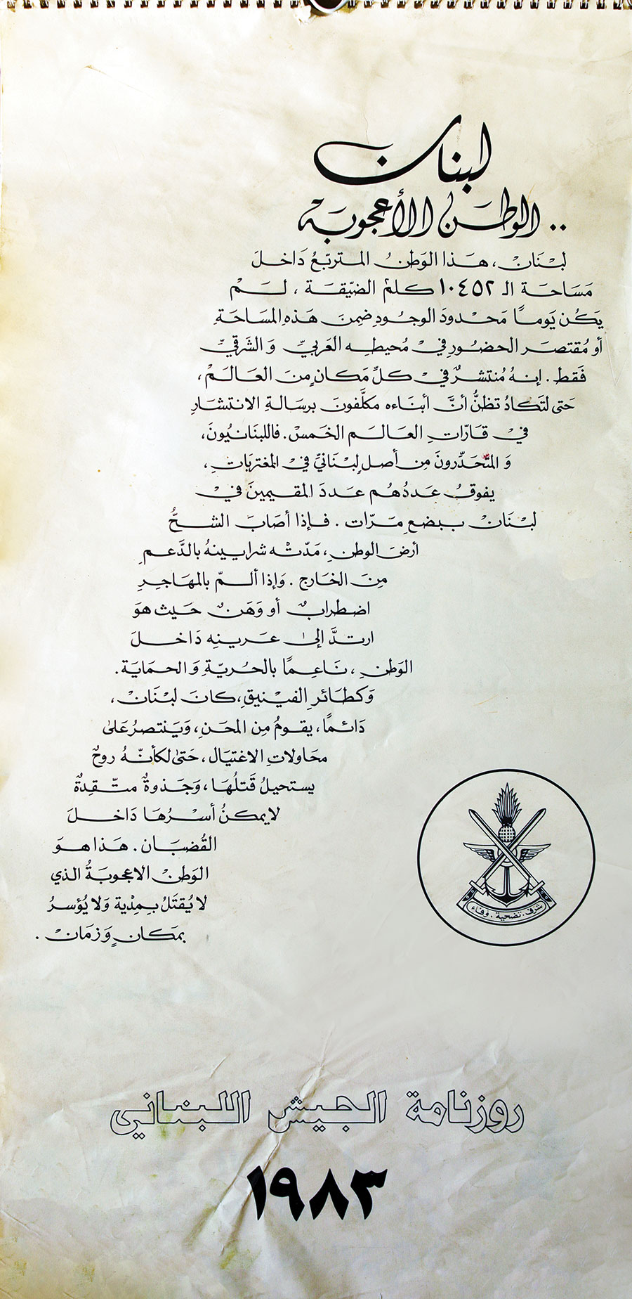 في خطٍّ موازٍ راهن بول غيراغوسيان على المؤسسة العسكريّة كدرعٍ حامٍ للوطن وكسياجٍ لكرامته، وكأساسٍ وسقف أمانٍ له، وعلى أفرادها من ضباط وعناصر، الذين بصمودهم وبسالتهم والتضحيات يصونون تاريخ لبنان وسلامه ويشقون مستقبله. «تقديرًا منه لهذه المؤسسة الجامعة، أعدّ غيراغوسيان روزنامتين للجيش: الأولى في العام 1982 بعنوان «ويبقى لبنان»، حيث توقظ ريشة الفنان البارعة التاريخ، في رسومات متنوّعة تتدفّق من الموروث التاريخي لتحكي حكاية الأرض التي وطأها الغزاة بهدف استعمارها ومن ثم تملّكها، ثم اندثار حضاراتهم وبقاء لبنان أزليًّا سرمديًّا منذ حضارة الأم التي هي الفينيقيّة الكنعانيّة، مرورًا بالعهود الفارسيّة فالإغريقيّة فالهلنستيّة فالرومانيّة فالبيزنطيّة فالأمويّة فالعباسيّة فالصليبيّة فالمملوكيّة وصولًا إلى العهد العثماني. «فتطل الذاكرة عبر هذا التاريخ لعلّها تسهم في فهم ذاتنا فتعطينا من ماضينا درسًا مفيدًا لحاضرنا ومستقبلنا». في الروزنامة الثانية في العام 1983 تحت عنوان «وأعطى لبنان»، يرسم الفنان فعل إيمان بلبنان بانتقالات رشيقة لريشة تراقص الألوان وتبحر في عالم الخلود الذي صاغته محطّات تاريخيّة من اكتشاف الأرجوان، إلى صناعة السفن، والبراعة في التجارة، وتطوير صناعة الزجاج (بدأ بها المصريون) وصولًا إلى تصدير الأبجديّة إلى العالم، ما أكسب لبنان دورًا رياديًّا في نشر المعرفة والحضارة في العالم آنذاك.
