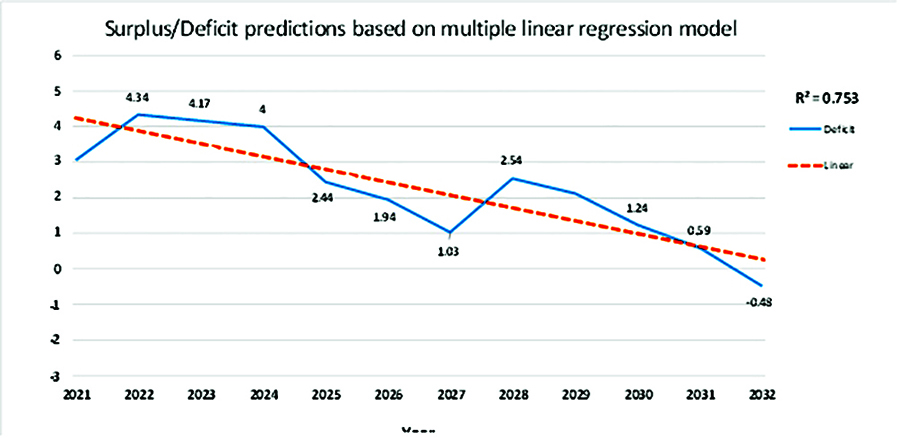At the end, the graph of the multiple linear regression model exhibit that after the public budget achieved a surplus, this surplus returned to decreasing and turned into a deficit again as of the second half of 2032.
