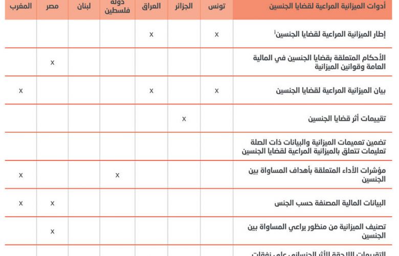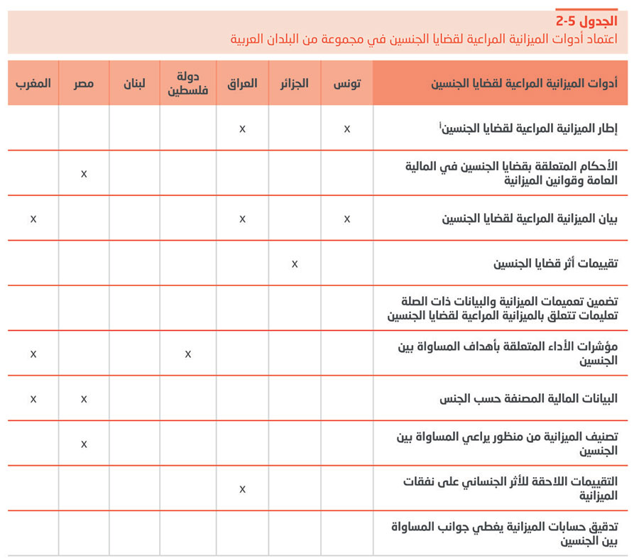 تؤدي الموازنات المراعية للنوع الاجتماعي دورًا محوريًا في تحقيق الهدف الخامس من أهداف التنمية المستدامة. فهي تَدمج بُعد النوع الاجتماعي في السياسات المالية، من خلال مراجعة كيفية توزيع الموارد العامة سواء في جانب الإنفاق أو الضرائب بما يعكس الفروقات الحقيقية في الاحتياجات والفرص بين النساء والرجال. وبهذا، تتحوّل المساواة من مجرد شعار إلى ممارسة فعلية تؤثّر في التخطيط المالي وصنع القرار. ورغم أهمية هذا التوجّه، ما زال تطبيقه في العديد من الدول العربية محدودًا، ويواجه مجموعة من التحدّيات، أبرزها: نقص البيانات المصنّفة حسب الجنس، ضعف القدرات الإحصائية، غياب الشفافية في إعداد الموازنات، وضيق الحيّز المالي، ما يقيّد القدرة على إعادة تخصيص الموارد بشكل منصف وفعّال. في هذا السياق، يُعدّ المغرب من الدول العربية الرائدة في اعتماد الموازنات المراعية للنوع الاجتماعي. فمنذ العام 2002، أطلق مبادرة طموحة بدعم من شركاء دوليين، تمثّلت في إنشاء «وحدة المساواة بين الجنسين» داخل وزارة الاقتصاد والمالية، وإصدار ملحق سنوي ضمن قانون المالية بعنوان «تقرير الميزانية المستجيبة للنوع الاجتماعي». وقد ساهم هذا النهج في توجيه الإنفاق العام بشكل أكثر دقة، لا سيما في قطاعات كالصحة، والتعليم، والتشغيل، بما يتلاءم مع احتياجات النساء والفتيات. وعلى الرغم من توافر أدوات تقنية تساعد على تفعيل هذا النوع من الموازنات - كما يظهر في الجدول ٥-٢ فإنّ استخدامها لا يزال غير منتظم أو منهجيًّا في معظم الدول. ولضمان فعالية هذا النهج، لا بدّ من توافر إرادة سياسية واضحة، وأطر مؤسسية قوية، وآليات متابعة وتقييم دقيقة، تضمن توجيه الموارد حيث تكون الحاجة الأكبر والأثر الأعمق على تحقيق العدالة بين الجنسين وتعزيز دور النساء في التنمية.