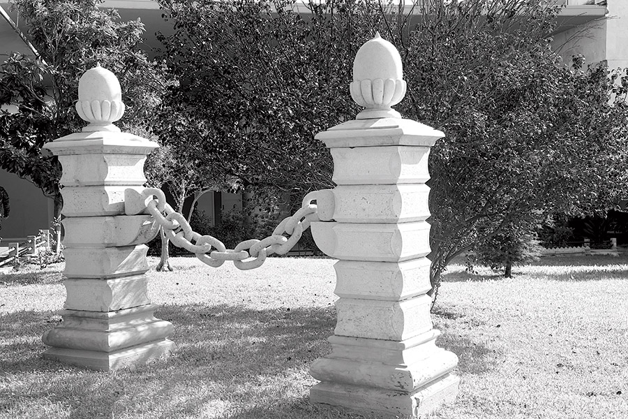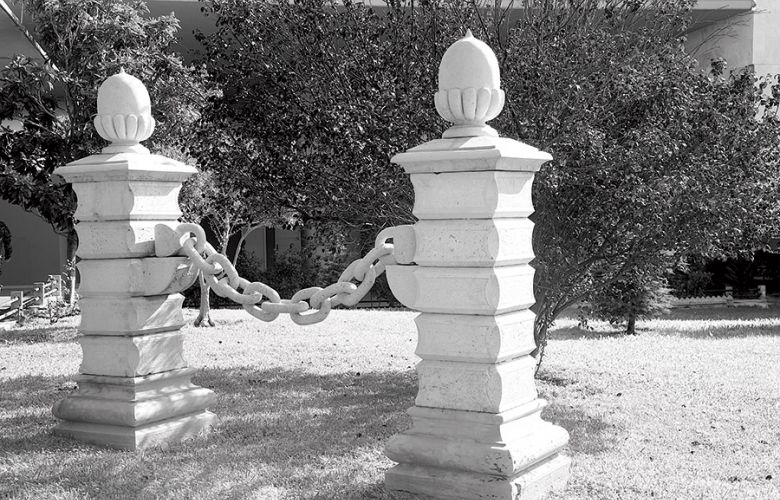 – عامودين من الصخر مرتبطين بسلسلة مصنوعة من الحجر، موجودين داخل الوزارة في الحديقة بالقرب من مخفر الشرطة.