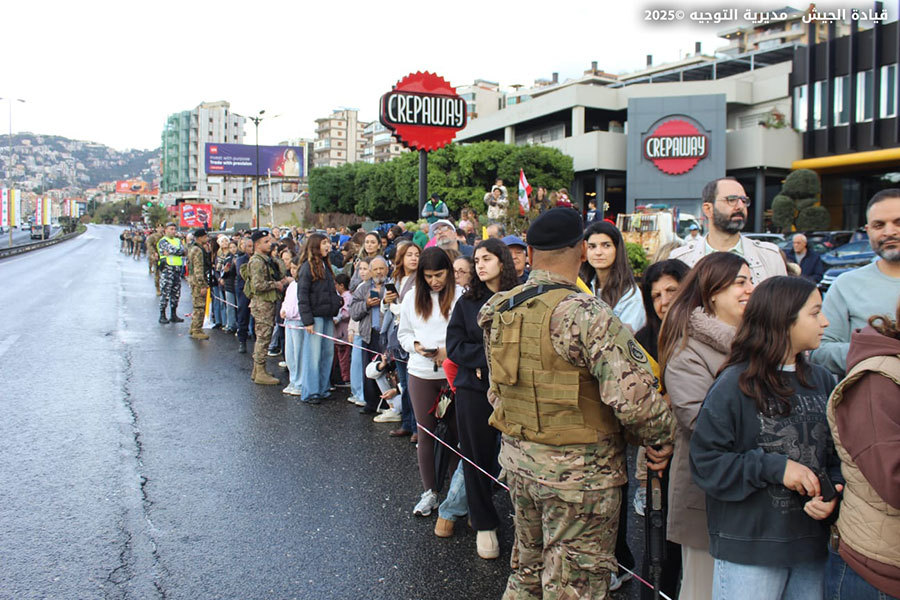 بمناسبة زيارة قداسة البابا لاوون الرابع عشر، ينفذ الجيش تدابير أمنية استثنائية تستمر حتى انتهاء الزيارة. وفي هذا الإطار، يترأس قداسة البابا بتاريخ 2 /12 /2025 احتفالًا بالقداس الإلهي في الواجهة البحرية في بيروت، لذا تدعو قيادة الجيش المواطنين إلى الالتزام بتوجيهات الوحدات العسكرية المنتشرة، وتعليمات باقي الأجهزة الأمنية خلال الاحتفال.