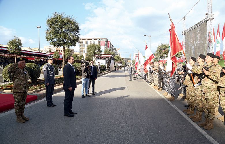 وبعد استعراض الوحدات المشاركة وتحية المشاركين في الاحتفال، توجّه الجميع إلى المنصّة الرئيسة حيث صافح رئيس الجمهورية الرئيس بري وعانق الرئيس الحريري قبل أن يجلس على المقعد المخصّص له.