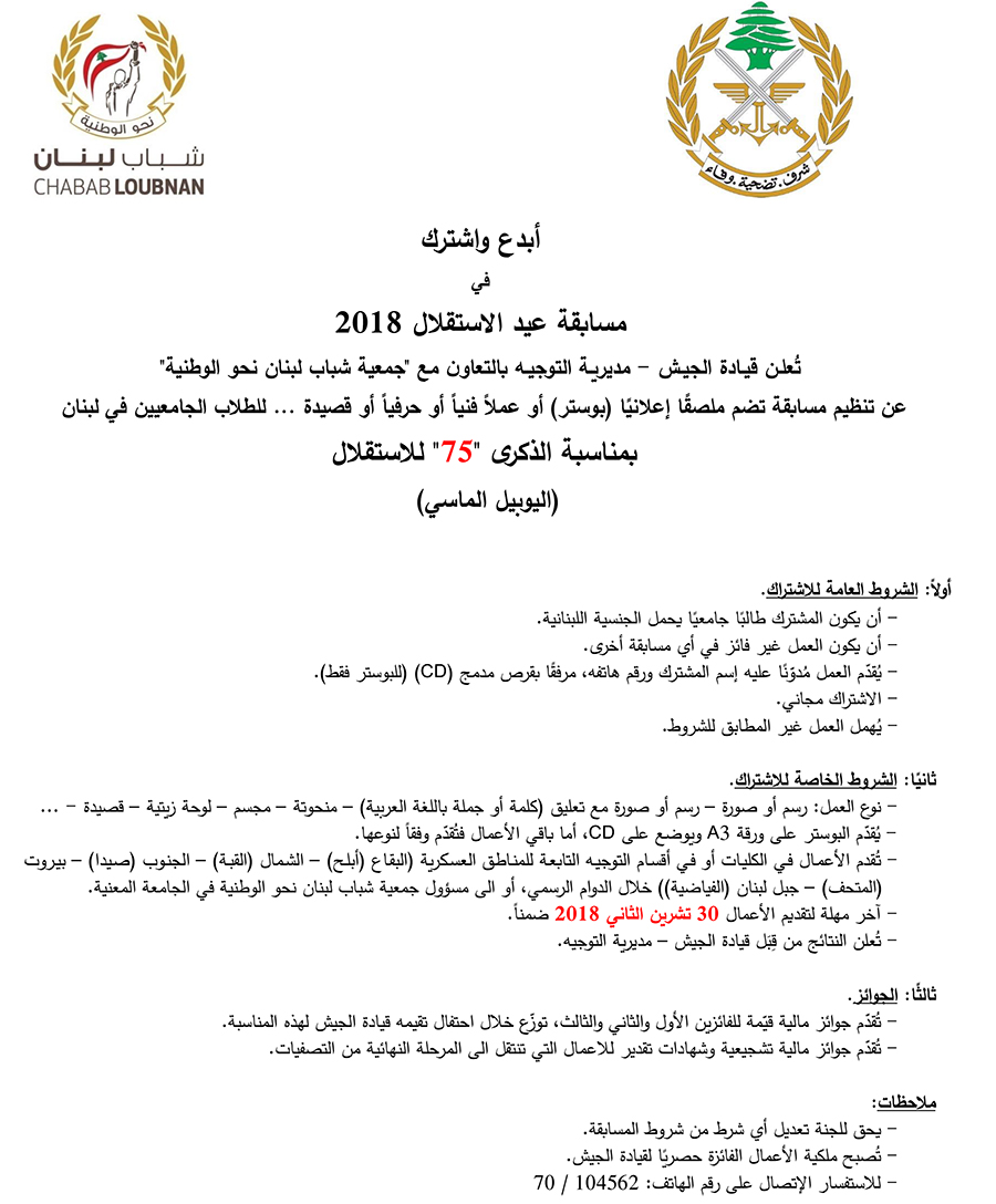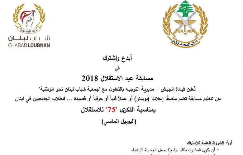 تتشرف قيادة الجيش – مديرية التوجيه، بالتعاون مع "جمعية شباب لبنان نحو الوطنية" بدعوتكم إلى المشاركة في مسابقة تضم ملصقاً إعلانياً (بوستر) أو عملاً فنياً أو حرفياً أو قصيدة... للطلاب الجامعيين في لبنان بمناسبة الذكرى "75" للاستقلال (اليوبيل الماسي)