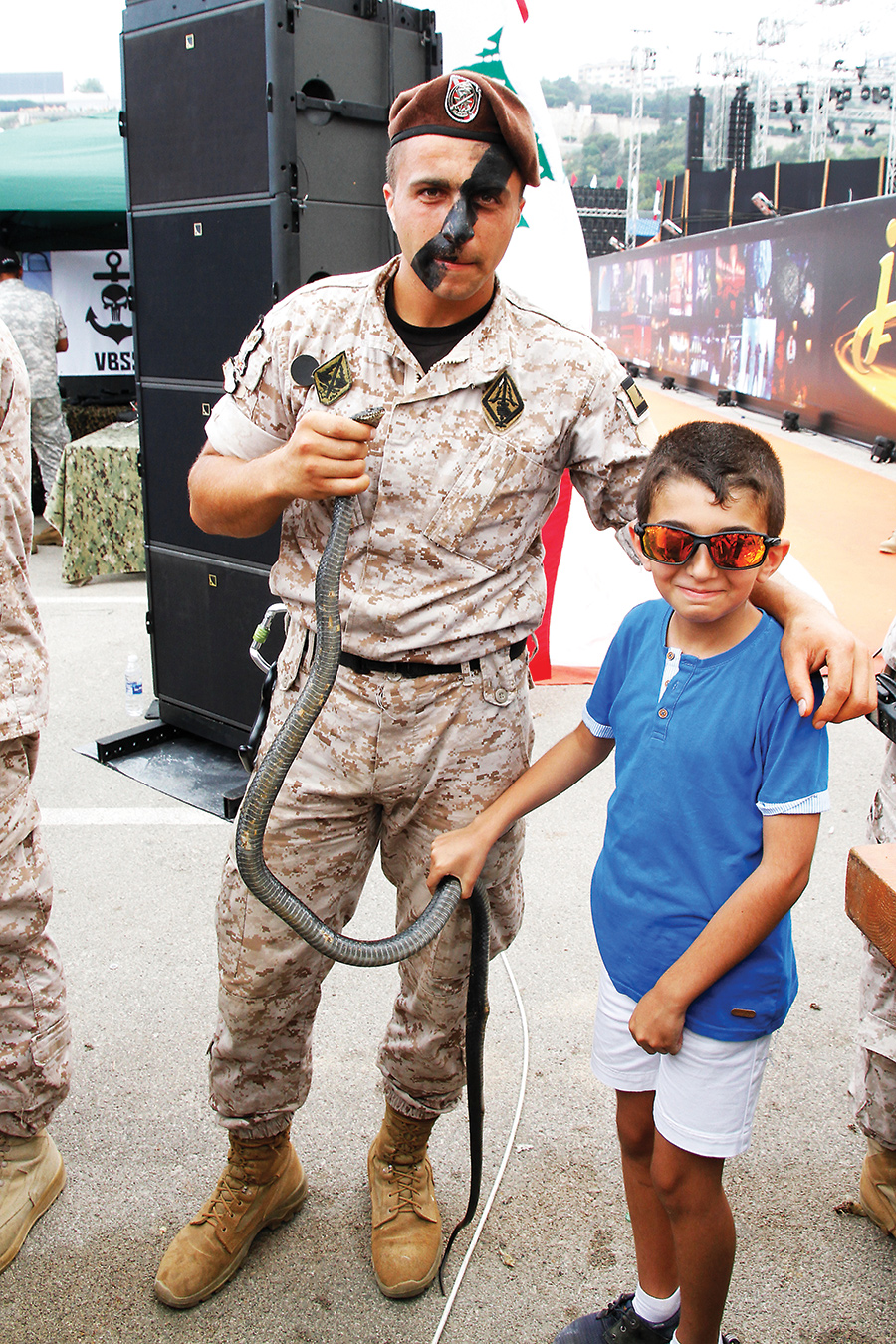 تشعر بفخرٍ واعتزاز كونك ترتدي البزة العسكرية وتعرف أنّك مصدر لفرح المواطنين وأمنهم. بهذه الجملة اختصر أحد العسكريين شعوره بينما هو مع مجموعة من الشباب في أحد المشاغل التي أقامتها الأفواج الخاصة في الجيش. نحييه وننتقل إلى مشغل آخر: شابة تحاول القيام بتمارين السواعد متشبّهةً بالعسكر المقاتلين. وعلى بُعد خطوات، طفل يشير إلى سلاحٍ ويقول لأخيه: «هيدي في مِنا بالـcall of duty، بتفجّر». ثم يستوقفنا مشهد طفل آخر يصعد على الدبابة من دون مساعدة رغم صغر حجمه. تقدّمنا إلى الأمام أكثر، لنستكشف سبب تجمع عدد كبير من الناس، فإذ بنا أمام عسكريين يقيمون حفلة شواء، أما المشاوي فبضع أفاعٍ اصطادوها، وهم يأكلونها وحولهم الناس ينظرون بدهشةٍ، وقد تذوق عدد منهم هذه الوجبة: «بعمل كل شي كرمال الجيش» قال أحدهم.