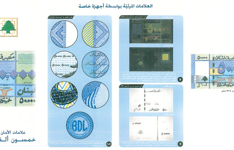 في إطار مكافحة تزوير العملة، أطلق مصرف لبنان حملة توعية حول كشف التزوير في العملات اللبنانية من فئة الألف، والخمسين ألف، والمئة ألف ليرة، (التي أصدرها حديثًا) عبر الاطلاع على مميزات كل منها وعلامات الأمان الخاصة بها. وقد ورد في خصائص كل منها الآتي: