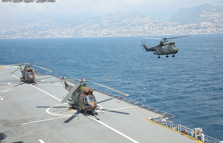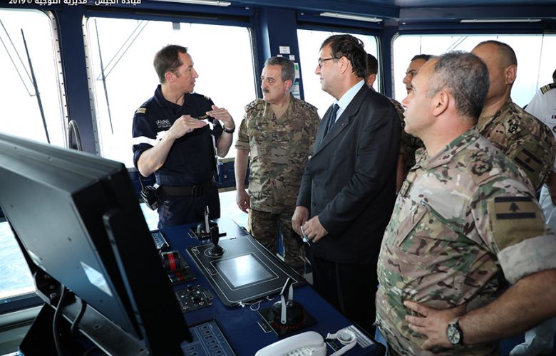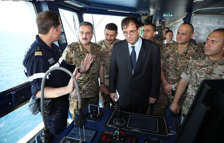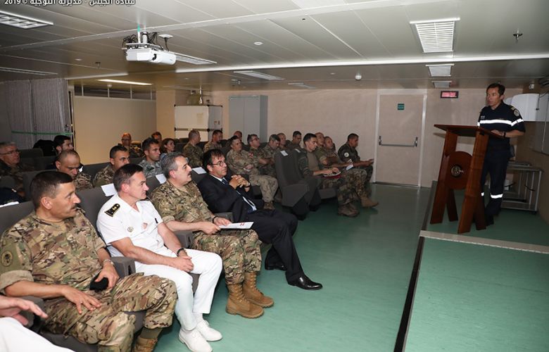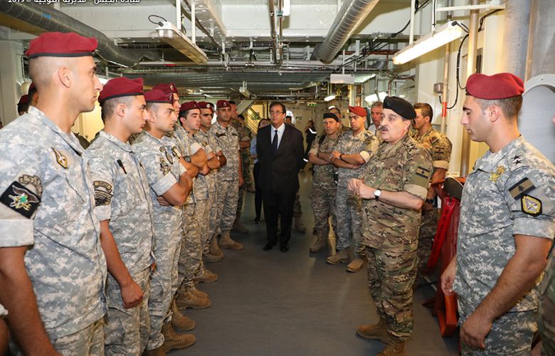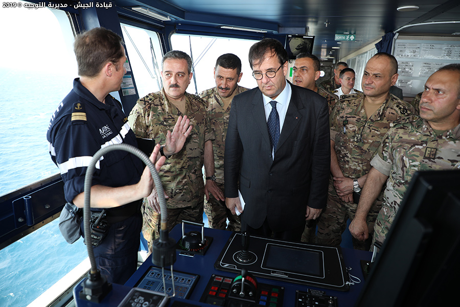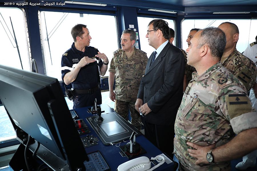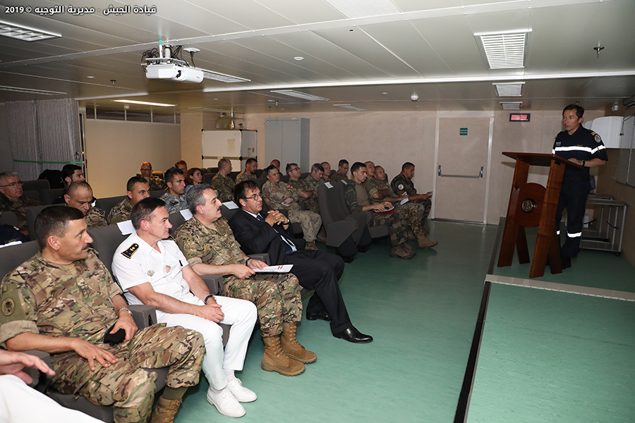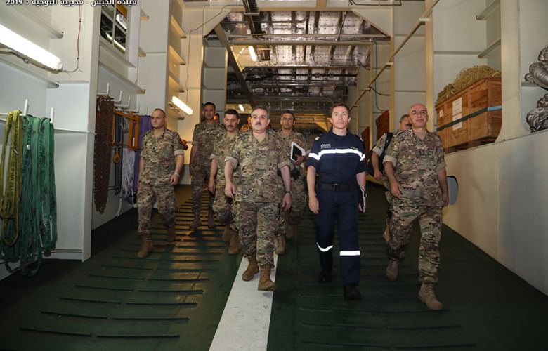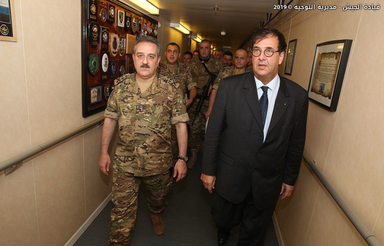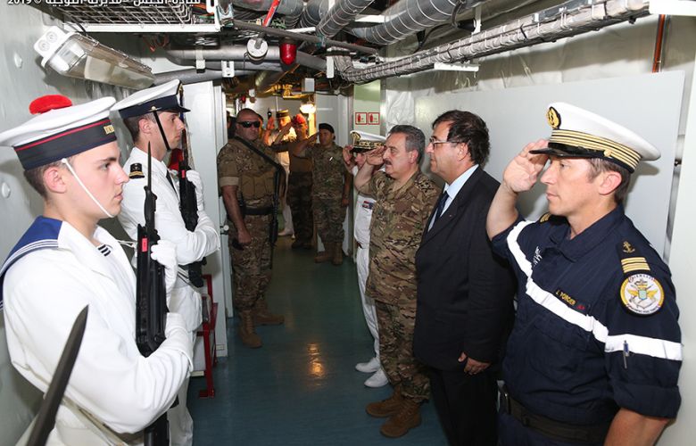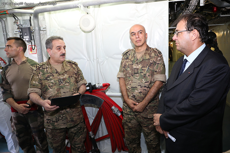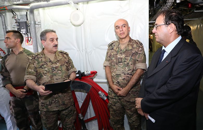 In the frame of the preparation for the Cèdre Bleu 2019 joint training drill between the LAF and the French army, the Armed Forces Commander in charge Major General P.S.C Amine el Erem visited the French Helicopter carrier Dixmude in the LAF, accompanied by the French Ambassador Bruno Foucher and the responsible for the responsible for foreign relations in the French Navy, Admiral Gilles Boidevizi and French military attaché Colonel Fabrice Chapelle. Major General el Erem toured the Helicopter carrier and was inspected its equipment. Major General el Erem also attended a briefing concerning the stages of the drill and participating forces, then met with LAF soldiers and provided them with the necessary directives. Moreover, Major General el Erem expressed his appreciation to the French army and the French authorities for their constant cooperation and support for the LAF.