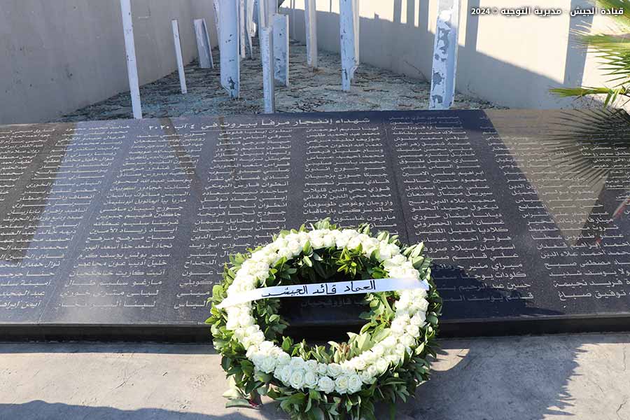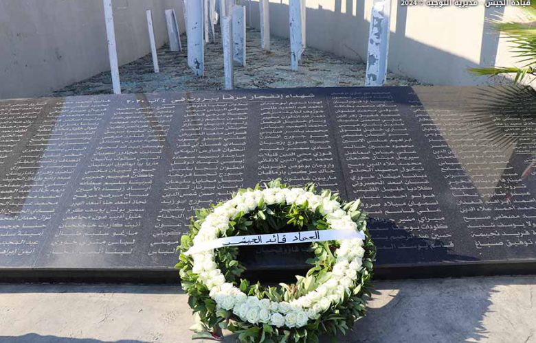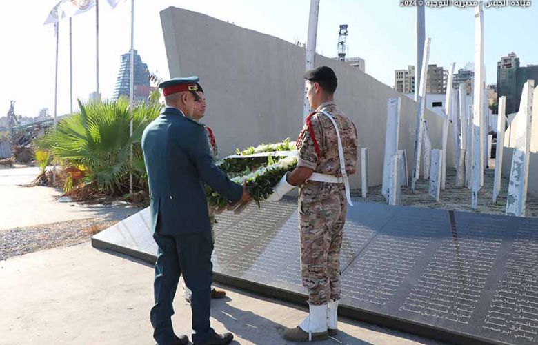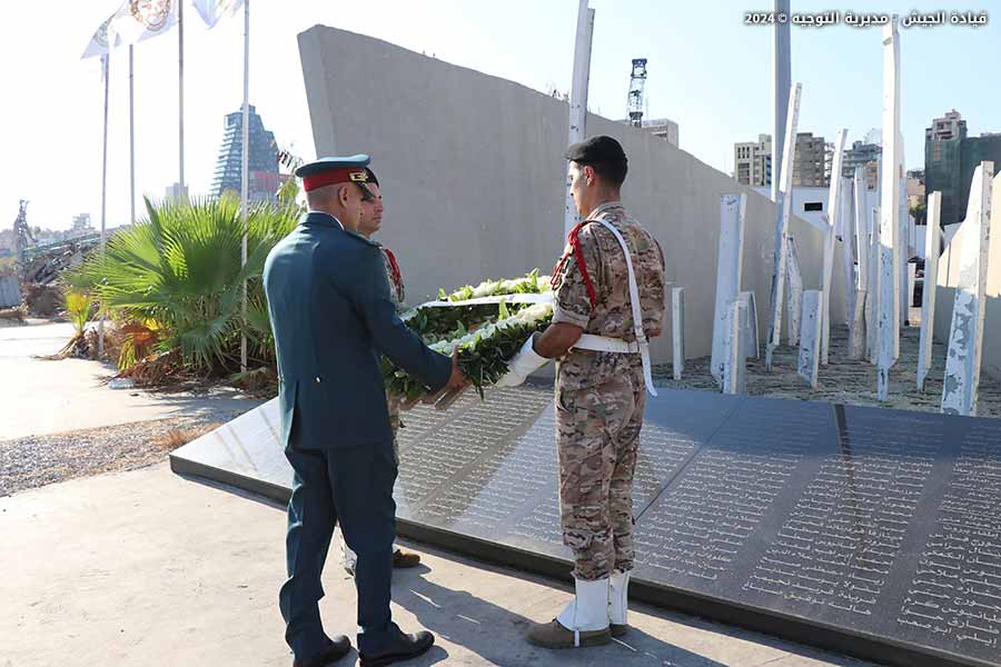 The representative of the LAF Commander, General Joseph Aoun, laid a floral wreath on the memorial monument for the victims of the Beirut port explosion, honoring their pure souls on the anniversary of the port explosion. A group of military personnel performed the ceremonial honors, and personnel from the Army Band performed the Hymn of the Martyrs and the Dead March.