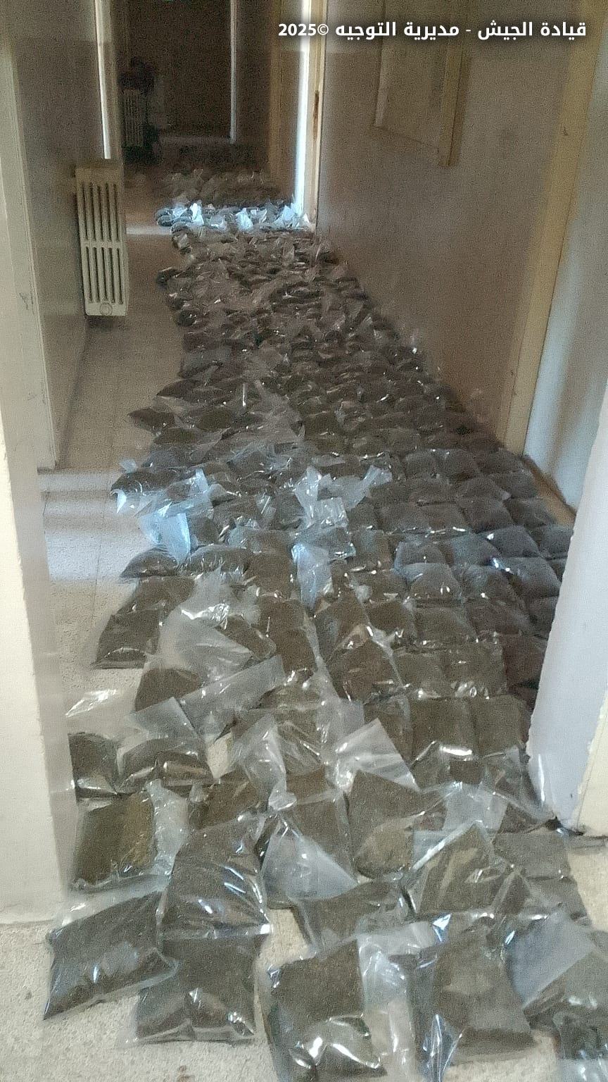 The Lebanese Army carried out a series of security measures in Bekaa and North to combat drug trafficking and arrested individuals disturbing public order. In this context, a patrol from the Directorate of Intelligence raided the residence of a wanted individual in Sharawneh – Baalbek and seized approximately 260 kg of “Silvia”, packaged and prepared for sale.